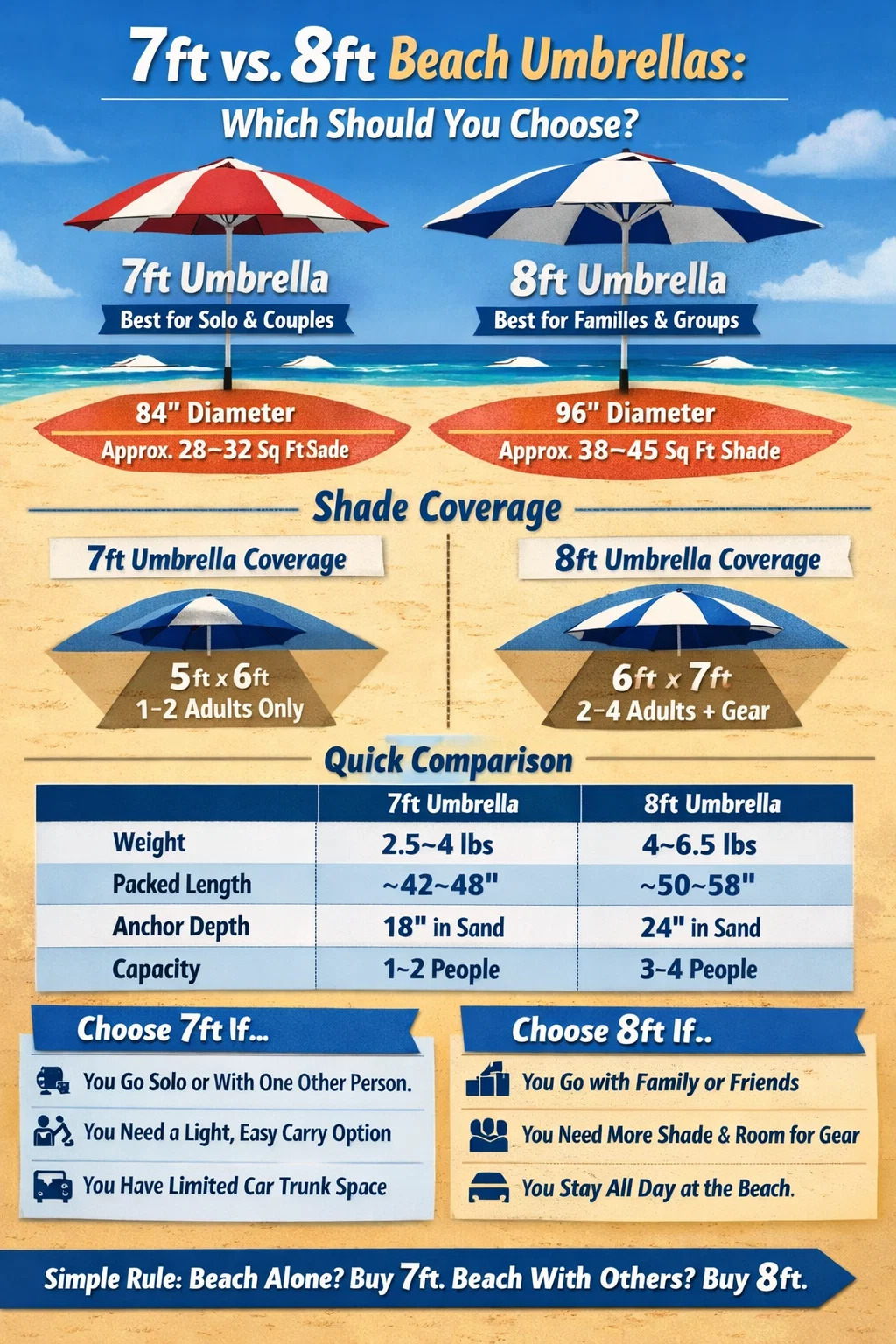 Si vous achetez un parasol et que vous vous demandez si un parasol de 7 pieds ou 8 pieds est le meilleur choix, voici la réponse directe : un parasol de plage de 8 pieds est préférable pour les groupes de 3 personnes ou plus, tandis qu'un parasol de 7 pieds est un choix plus judicieux pour les individus ou les couples qui privilégient la portabilité. La différence de diamètre de la canopée entre ces deux tailles se traduit par un écart important dans l’ombre utilisable – et cet écart est important lorsque vous essayez de garder toute votre famille au frais par une chaude après-midi d’été.