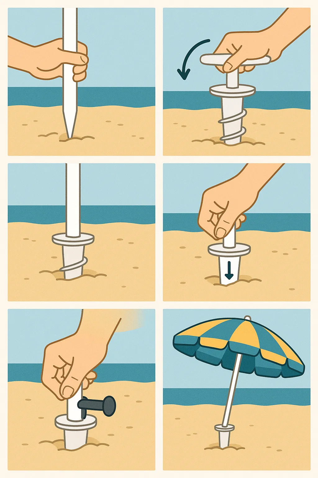 Utiliser une ancre à sable avec votre parasol garantira que le parapluie reste stable dans la brise marine. Voici les étapes détaillées :