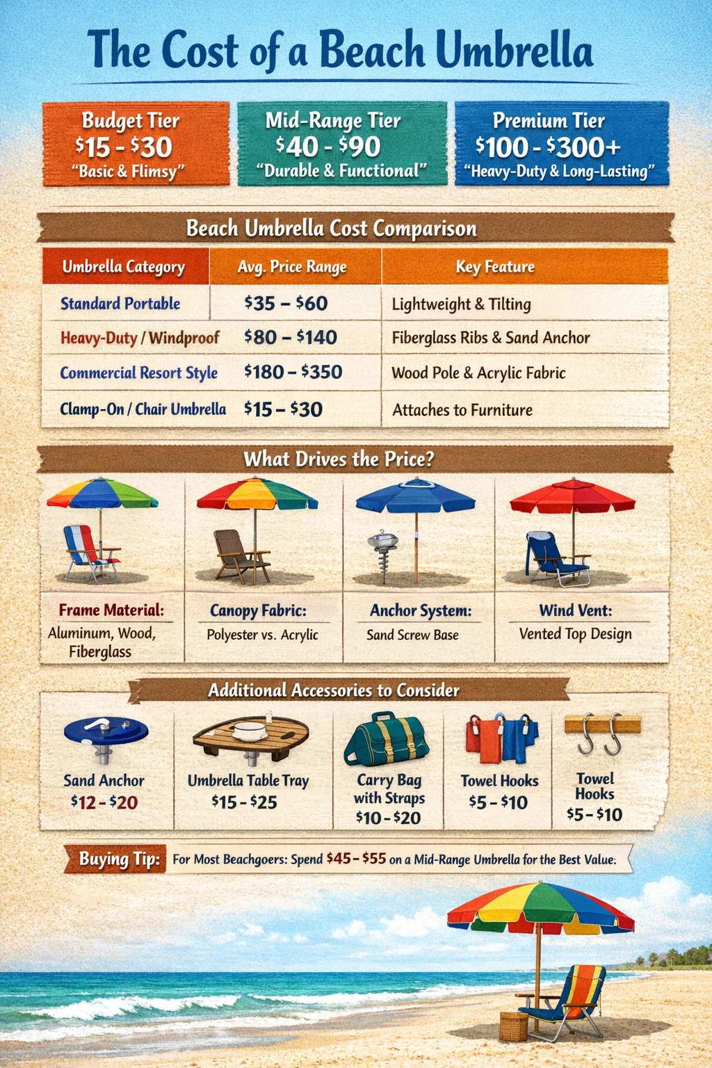 Pour le voyageur occasionnel qui va à la plage deux fois par an, dépensant 45$ à 55$ sur un milieu de gamme parasol est le « point idéal ». Il offre suffisamment de durabilité pour résister aux brises typiques du bord de mer sans se ruiner. Si vous habitez à quelques minutes en voiture de l'océan et prévoyez des visites hebdomadaires, investissez 120 $ ou plus dans un modèle robuste avec des nervures en fibre de verre, vous économiserez de l'argent et de la frustration à long terme.
