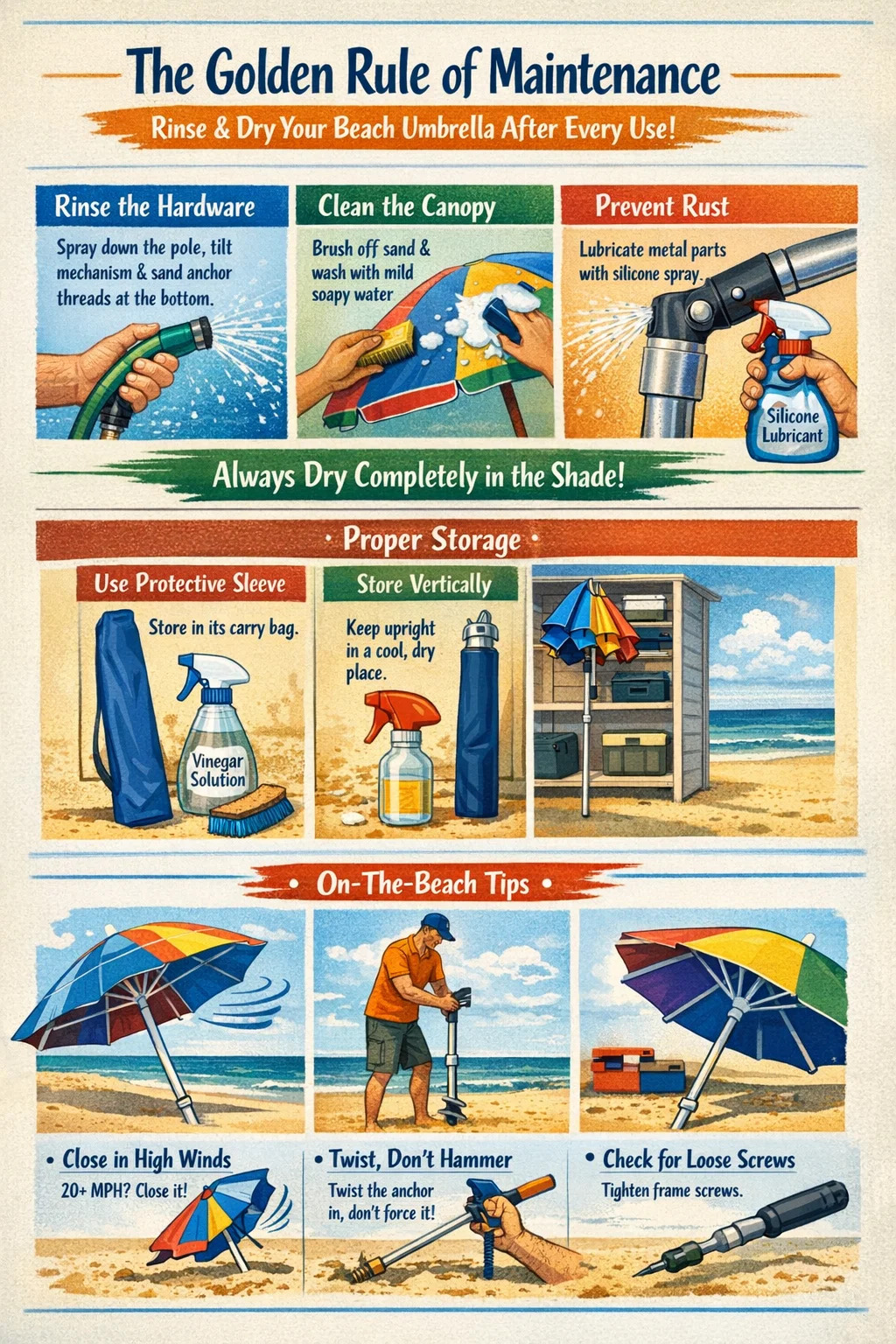 L'étape la plus critique pour maintenir un parasol est de rincez-le à l'eau douce et séchez-le complètement après chaque utilisation. L’eau salée et le sable agissent comme des agents corrosifs qui dégradent les tissus et rouillent les joints métalliques. En passant cinq minutes à rincer votre équipement, vous pouvez prolonger sa durée de vie d'une seule saison à plus. cinq ans d'utilisation fiable .