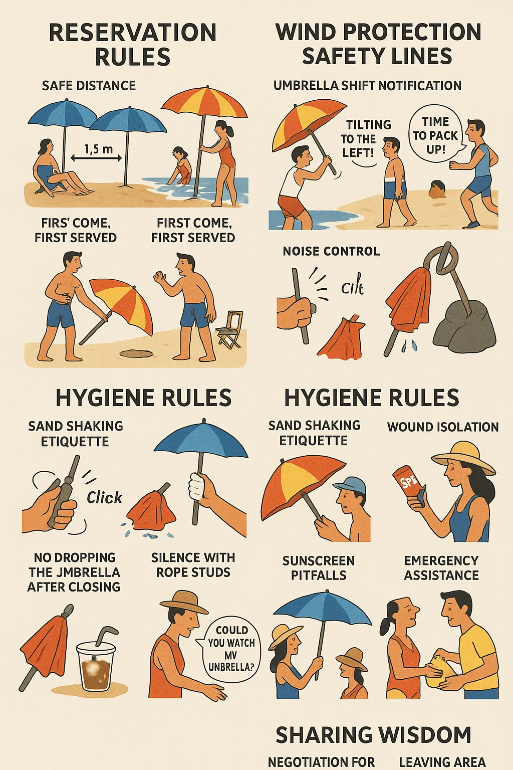 Étiquette pour secouer le sable : Avant de fermer votre parapluie, secouez-le trois fois dans un endroit isolé pour éviter que du sable ne pénètre dans les sandwichs des autres.